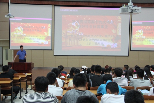 开班仪式后,陈毕栋书记作了专题辅导报告《学习贯彻落实十九大精神,搞好社会体育事业》。他向同学们分享了自己学习十九大报告的心得认识,结合学院专业发展重点就如何抓住机遇,贯彻落实报告精神,深入推进全民健身有关工作,以新思想引领全民健身新实践,以全民健身实现全民健康,促进全民幸福。