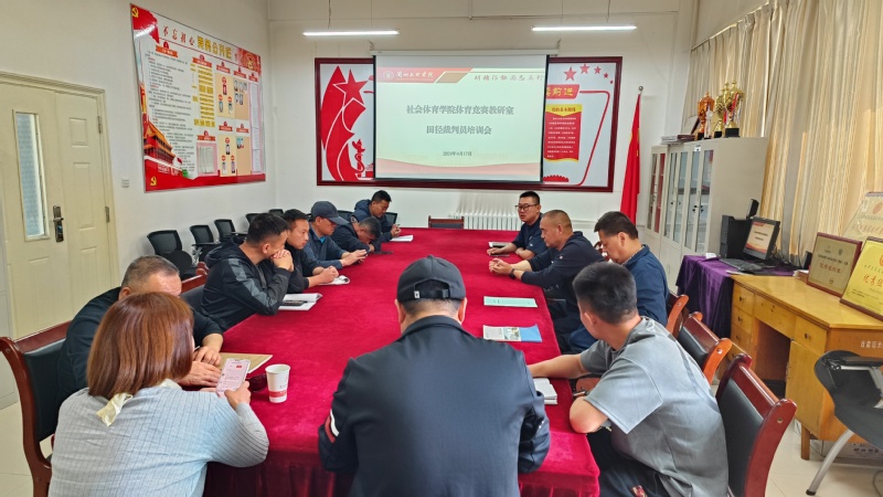 保障2024年城关区中小学生田径运动会和我校十一届校运会顺利召开,417上午,在学院党员活动室217召开2024城关区中小学生田径运动会暨学校第十一届校运会田径裁判员培训会。会议由体育竞赛教研室主任刘曼冬主持,田径项目国家一级裁判员陈维新老师主讲,学院全体教师参加培训