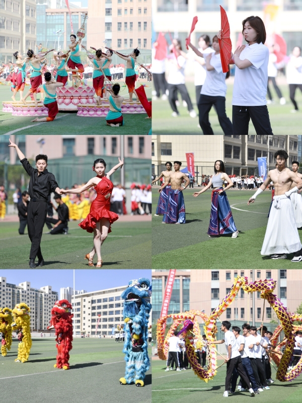 庄严的升旗仪式后,以“文化传承与体育创新”为主线的体育文化展演点燃开幕式高潮。《盛世敦煌》里,学生们手持琵琶等道具,队列变换再现“飞天”神韵,展现对丝路文化的传承创新;《敦煌拳艺》刚劲有力,演绎敦煌风骨与武术阳刚之美;《龙腾狮跃》中,巨龙翻腾与醒狮相映,象征中华体育精神不息;《形体展示》《体舞之韵》以现代形式诠释青年“健康第一”理念。展演融合民族体育元素与现代健身理念,是“体教融合”的生动实践,也是校园文化育人的具象呈现。
