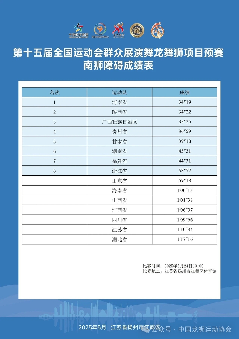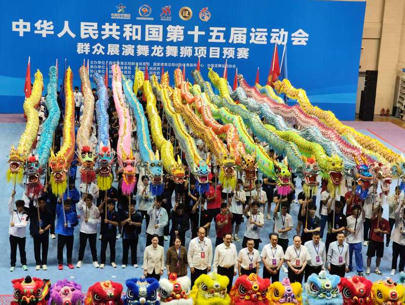 5月22- 26日,第十五届全国运动会群众展演舞龙舞狮项目预赛在江苏扬州江都体育馆举行。此次赛事吸引了全国23支运动队、约1300多名运动员参赛,涵盖舞龙自选、舞龙规定、舞龙障碍、南狮自选、南狮传统、南狮障碍、北狮自选、彩带龙自选8个项目。